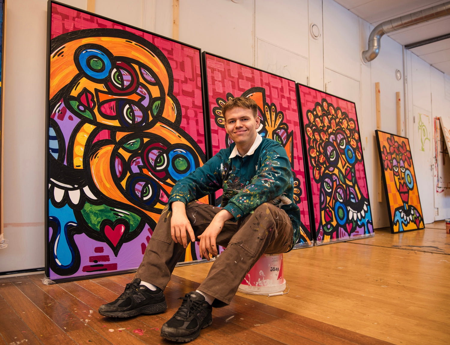 Lavrans Borgen's paintings are characterized by warm, clear colors and clear motifs. The images are built up of color fields separated by black and white lines. This gives a clear and stylish expression. The images are saturated with color, but equally airy. People and animals are depicted against a lively background, where motif and background highlight each other. The artistic expression balances the graphic with the organic, the simple with the expressive. The motifs often convey a calmness - it is good for the viewer to rest their eyes on the paintings. People and relationships are depicted with clarity and warmth. Borgen explores, among other things, family relationships - mother and son, father and son, and the sibling relationship. Here, security, affection and gratitude are central themes. On the other hand, Lavrans is very fascinated by how chaotic, humorous and strange interactions can occur, both between people and animals.